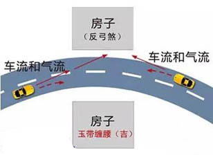 宅前方的道路或河流向外弯曲,构成反弓形。犯之主失财破财、身体亦多病。